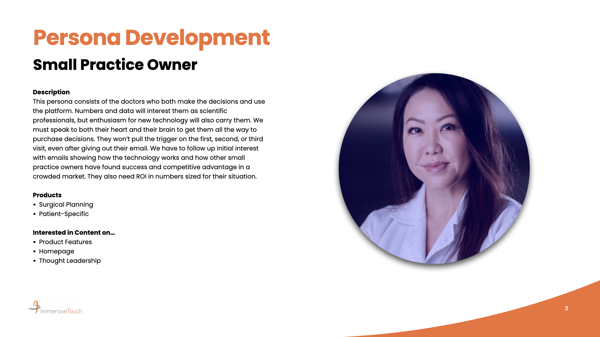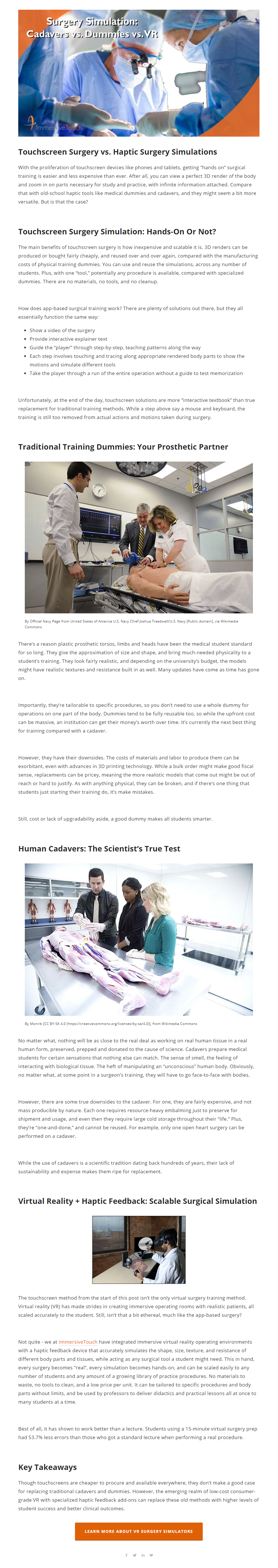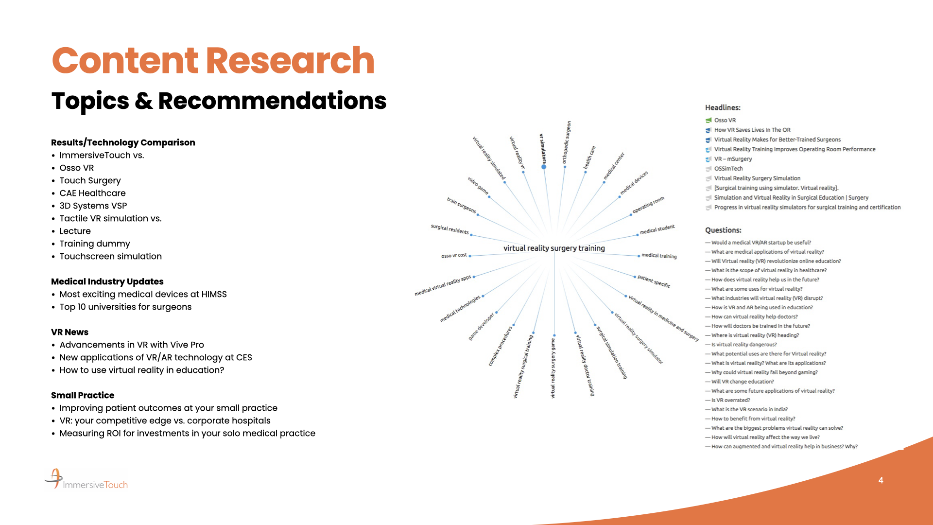 ImmersiveTouch Inc., a medical VR company that produces hardware and software to help train surgeons, needed to increase organic traffic to their newly-launched website and build interest in their innovative training simulations. They had no advertising budget, and a 6-month turnaround time. As a principal content strategist, I and my team of writers and designers were brought in to consult on the best course of action, with a goal of a 10% increase in organic traffic over that time period.