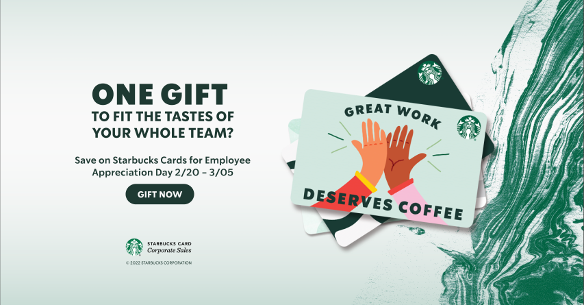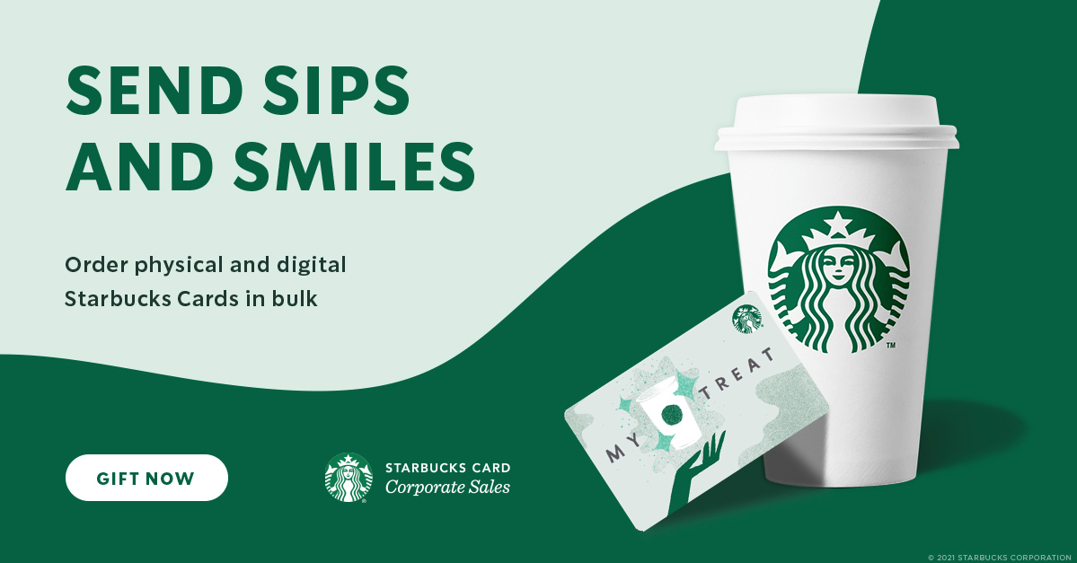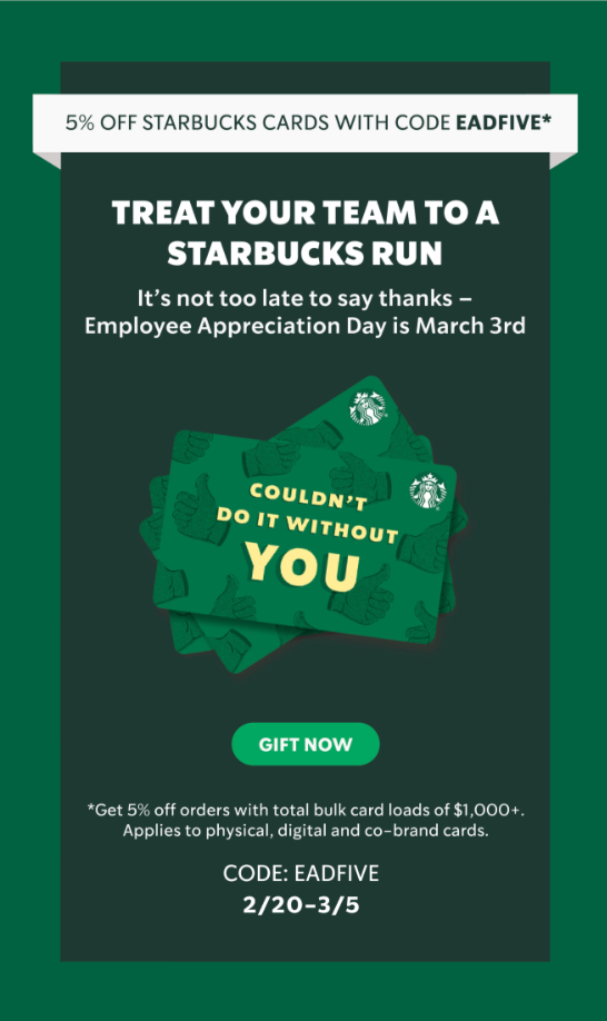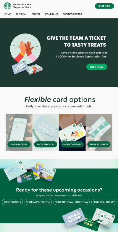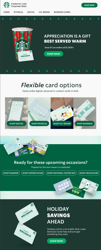 The Starbucks B2B Corporate Gift Card team needs several annual campaigns to help drive bulk orders of their Starbucks Cards throughout the year. Email, display ads, and banners on their B2B site are run for dozens of employee, product, and season-based holidays.