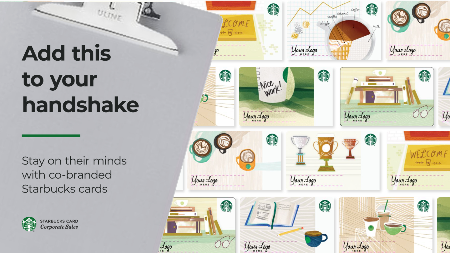 As the senior copywriter I worked with design and creative director partners at an agency, and marketing managers at Starbucks to develop consistently high-performing copy. Each campaign has several possible concepts and executions, driven towards the buyers who are typically in roles like executive assistant at large corporations, stressing the ease-of-use, the ubiquity of love for Starbucks among teams and customers they might give the cards to, and the versatility thanks to many designs for different industries and occasions.