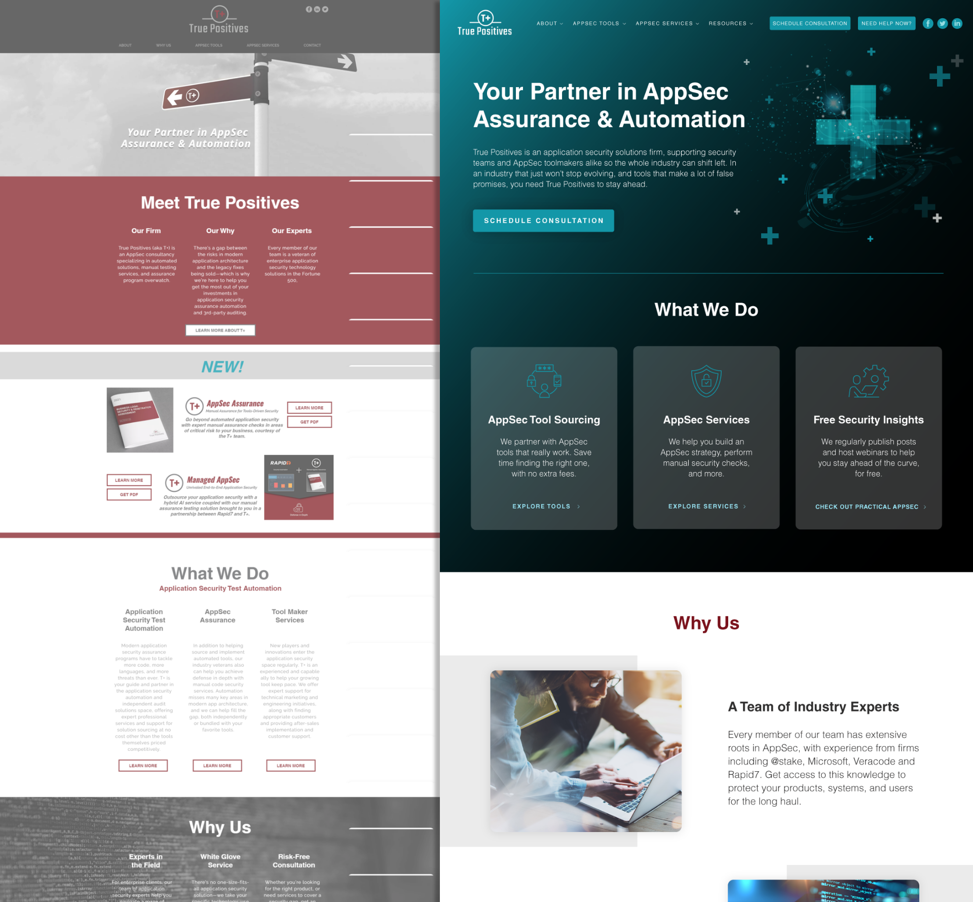 True Positives is an application security consultancy that helps SMBs create better AppSec practices with limited budgets. They had recently launched their consultancy with a pre-made Wix website, some Canva graphics, and self-written copy. All this to say, very DIY. They approached me to help them edit copy and make their offering easier-to-understand, and grew to need a total refresh on the brand.